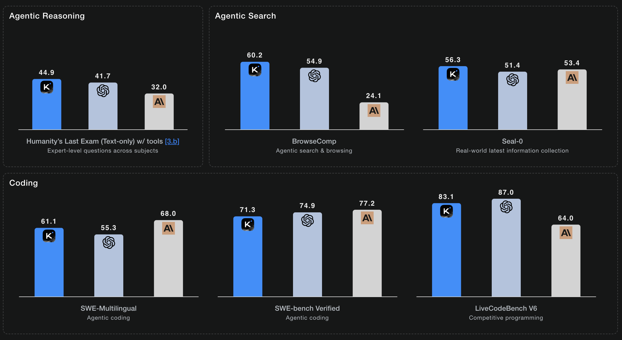 Kimi K2 Thinking sets new records across benchmarks that assess reasoning, coding, and agent capabilities. K2 Thinking achieves 44.9% on HLE with tools, 60.2% on BrowseComp, and 71.3% on SWE-Bench Verified, demonstrating strong generalization as a state-of-the-art thinking agent model.