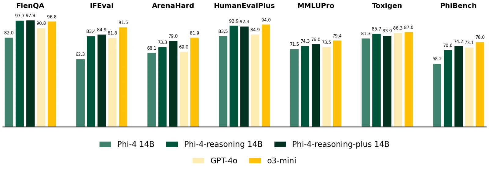 Accuracy of models across general-purpose benchmarks for: long input context QA (FlenQA), instruction following (IFEval), Coding (HumanEvalPlus), knowledge & language understanding (MMLUPro), safety detection (ToxiGen), and other general skills (ArenaHard and PhiBench).