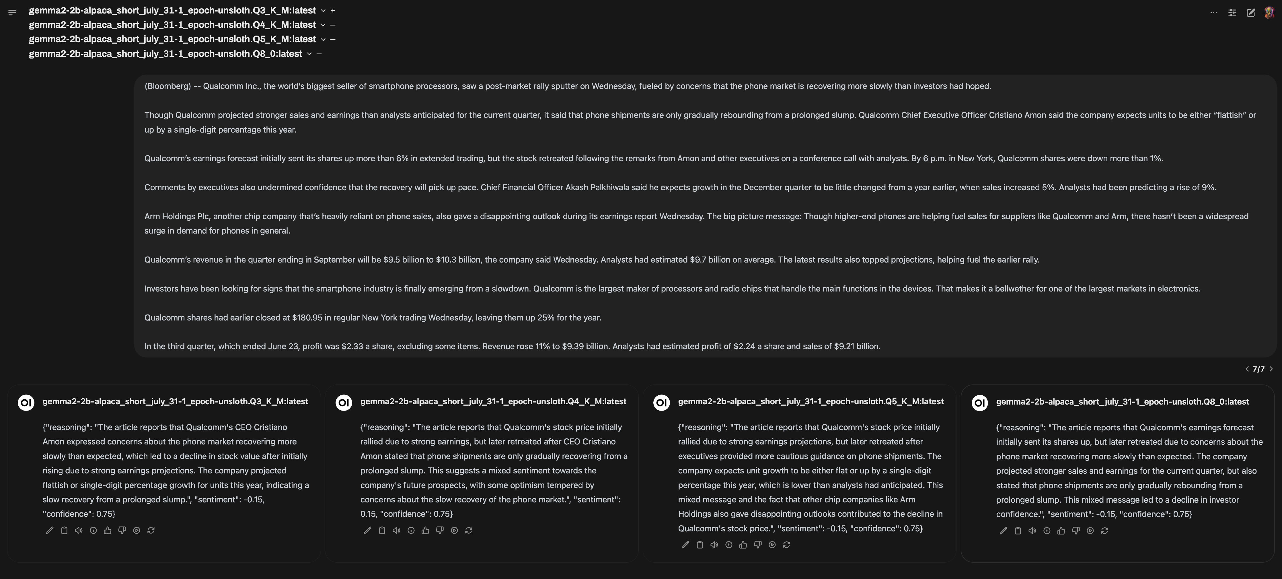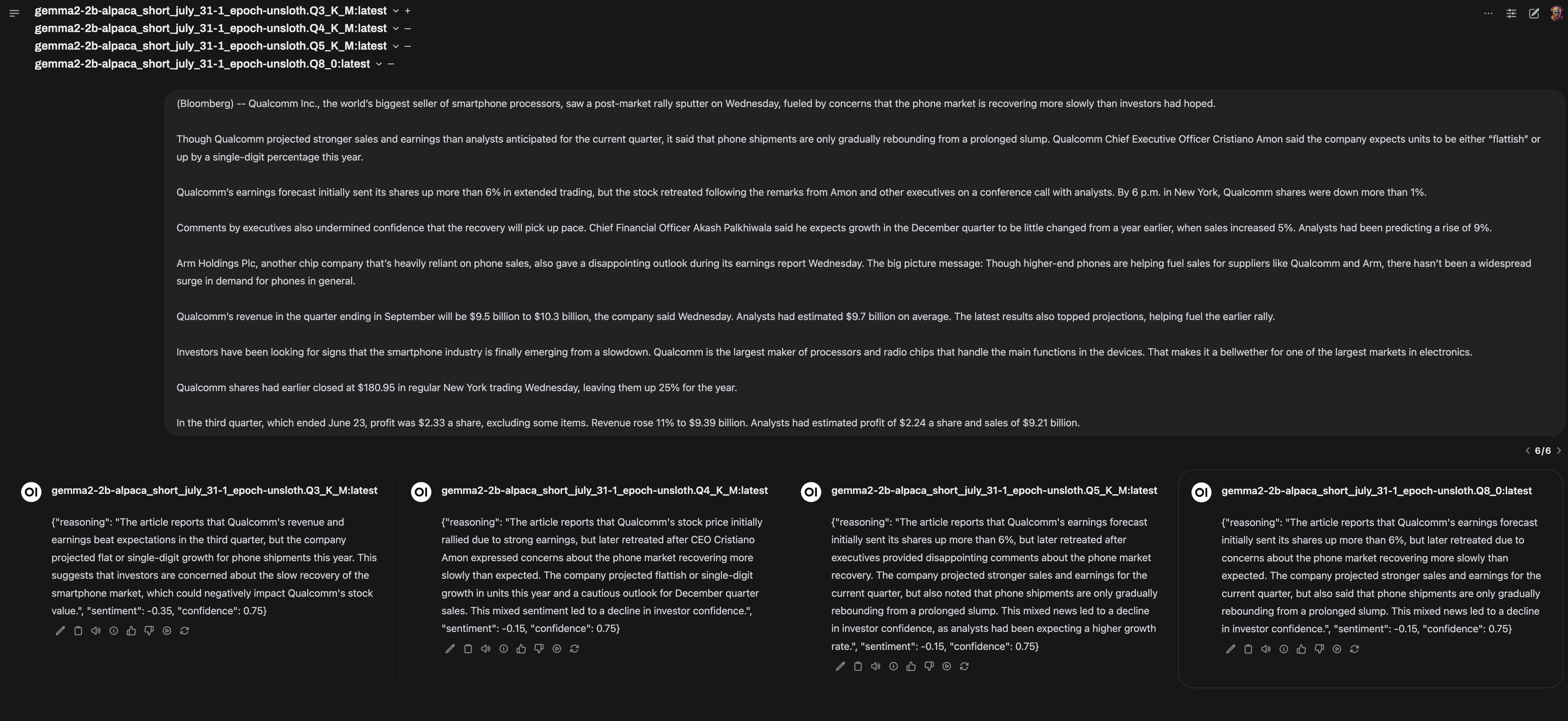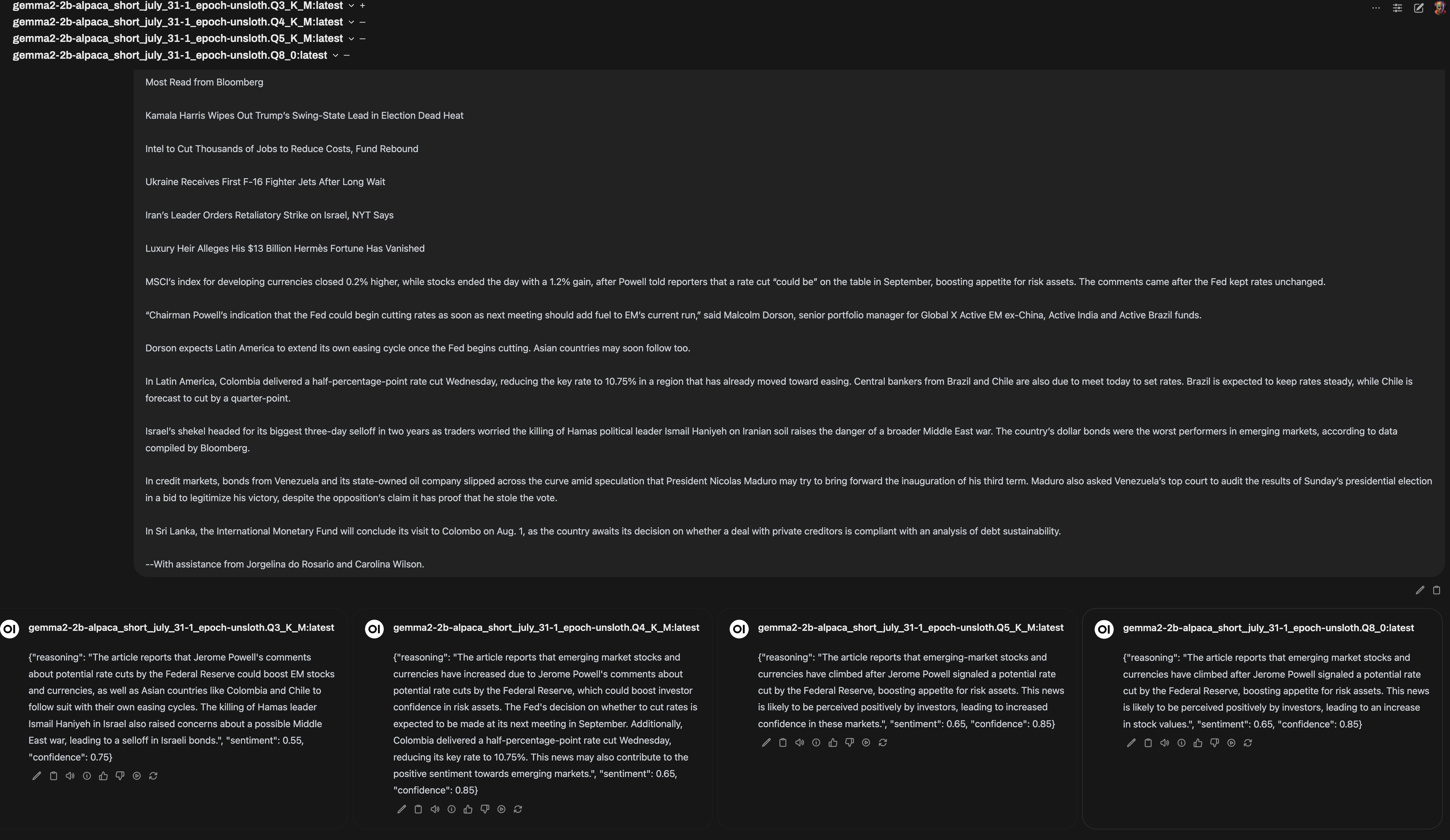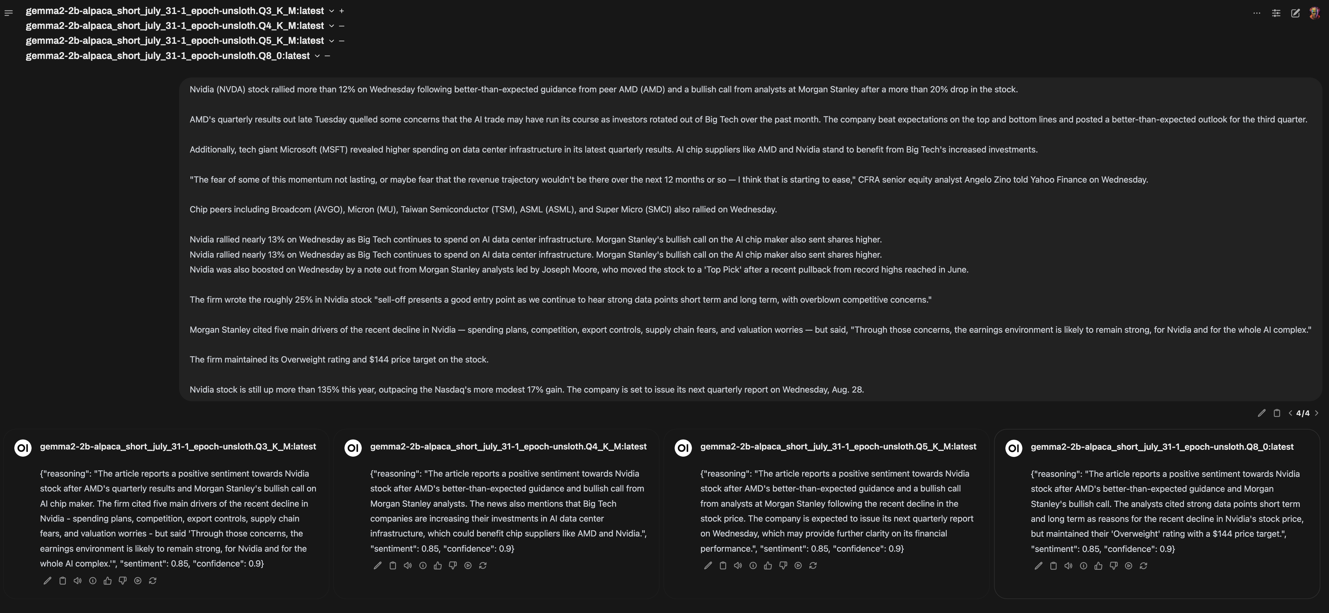 Gemma 2 2b fine tuned for sentiment analysis of financial articles, give it an article -> outputs a specific JSON format with confidence and reasoning values: