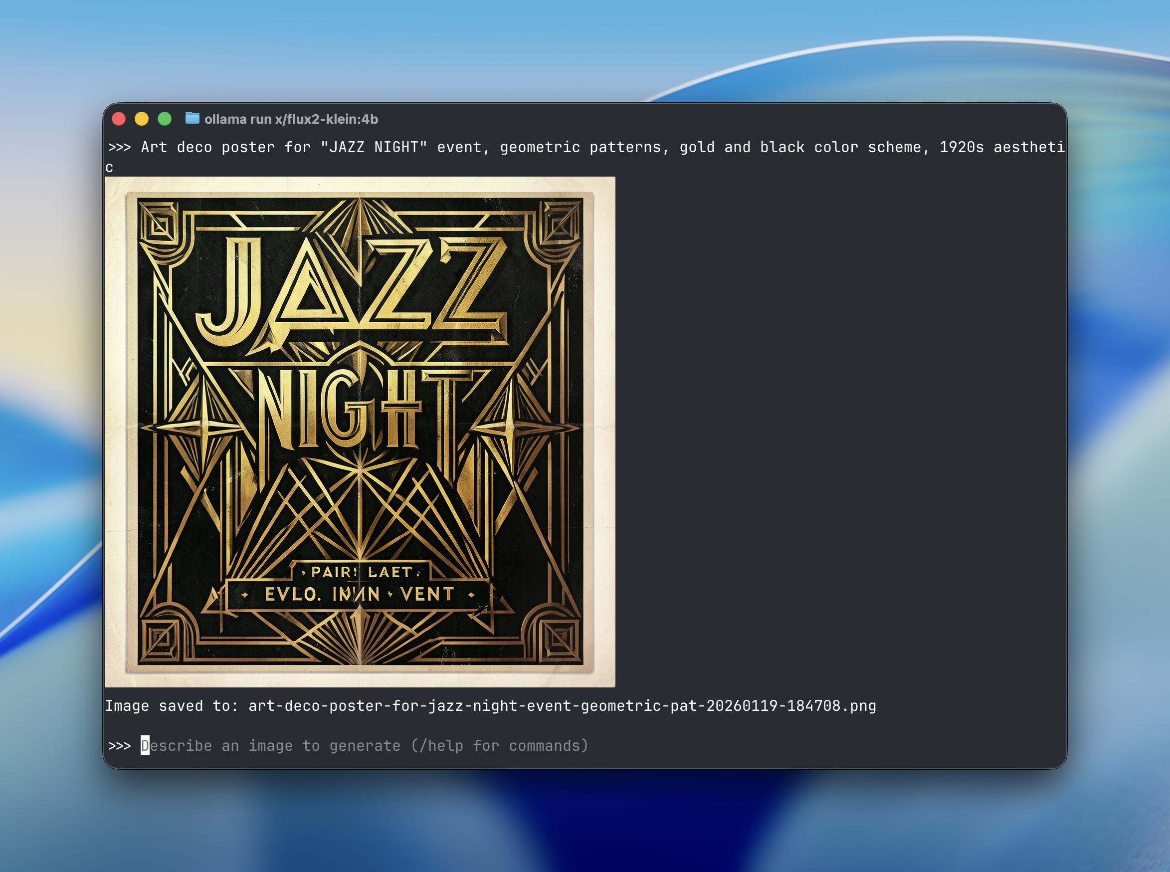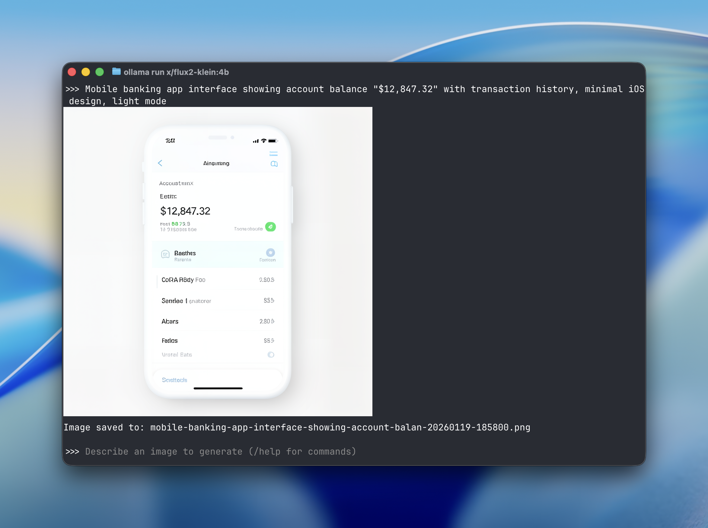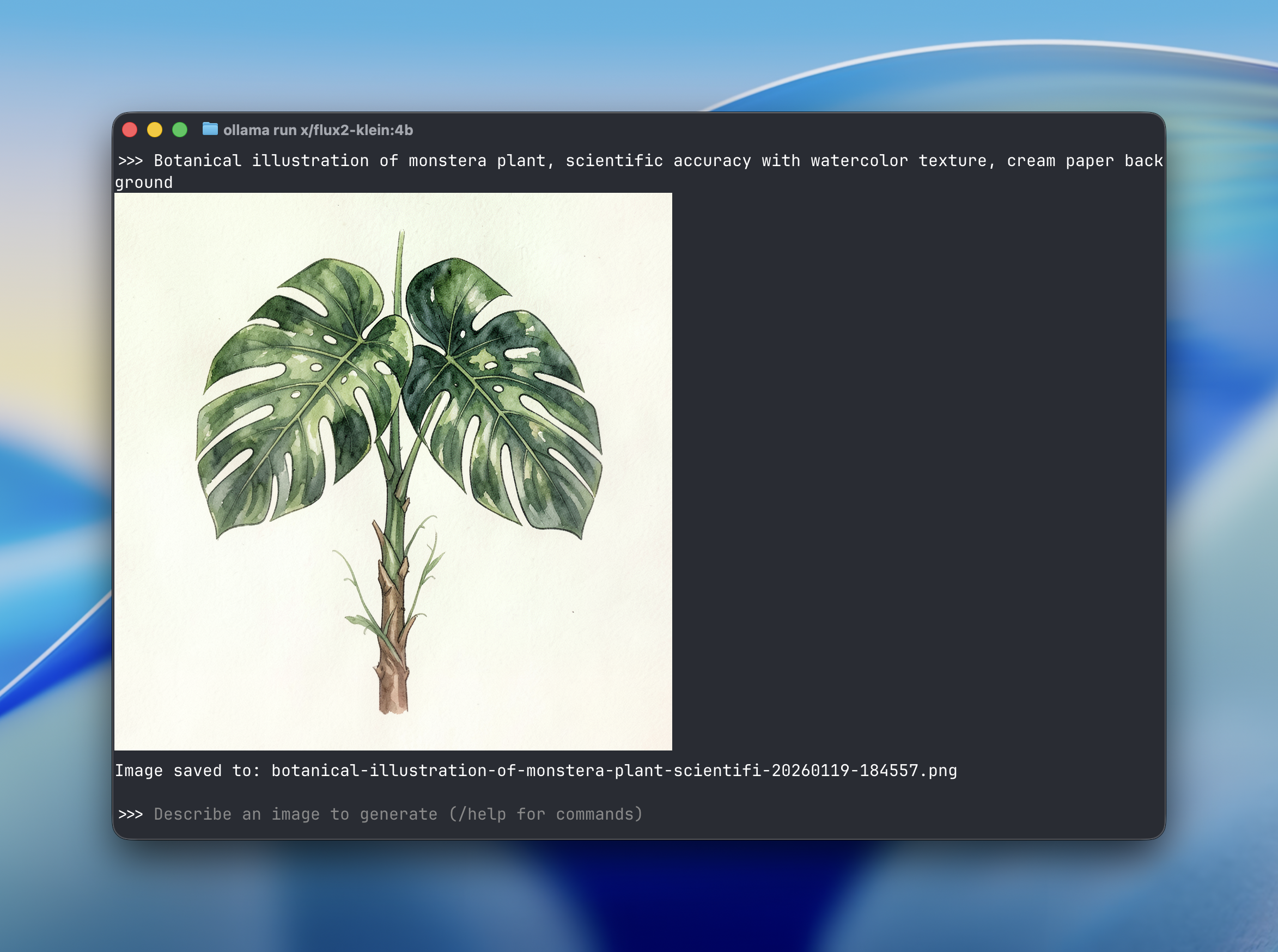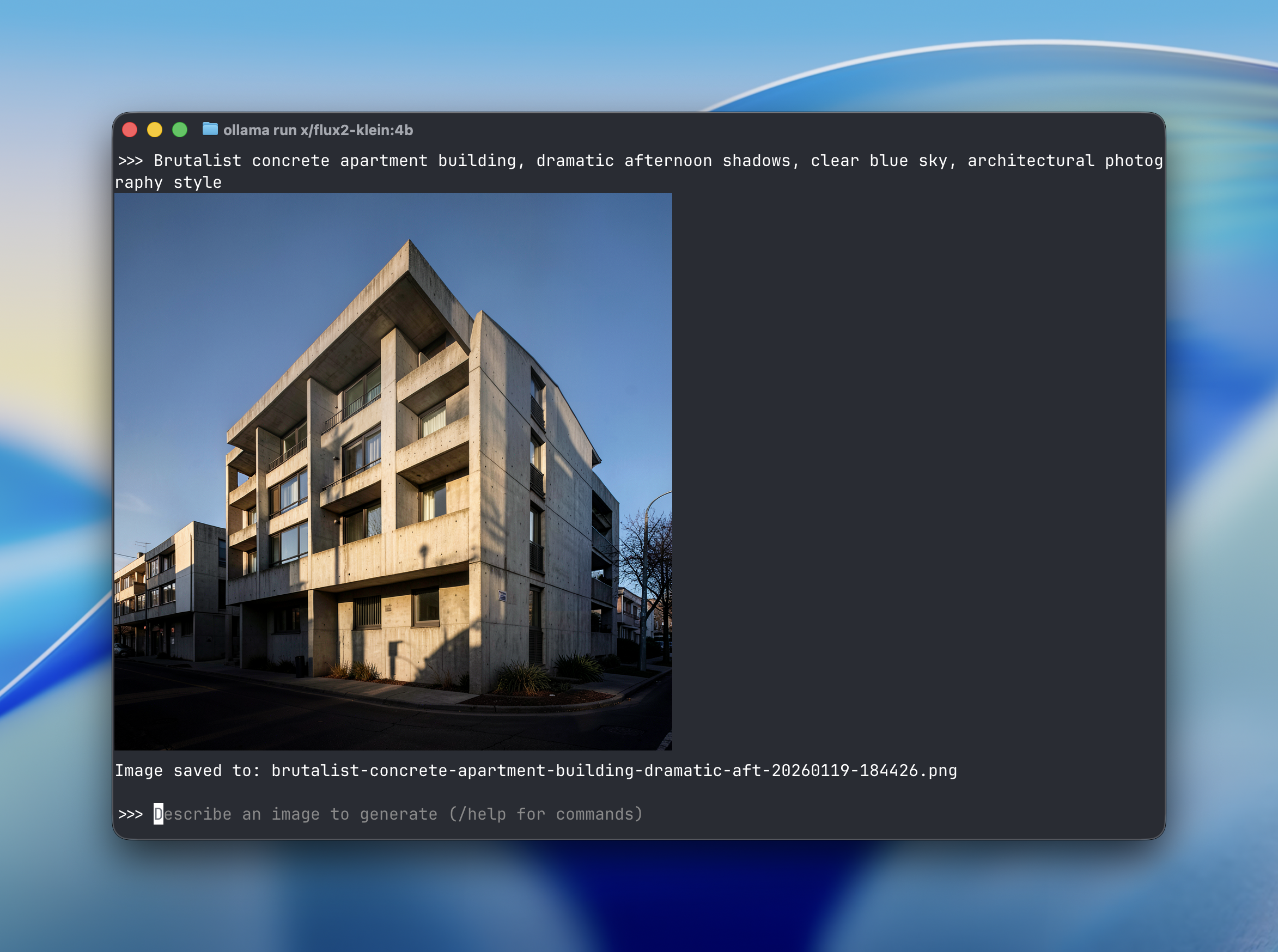 ollama run x/flux-klein "a cat holding a sign that says hello world"