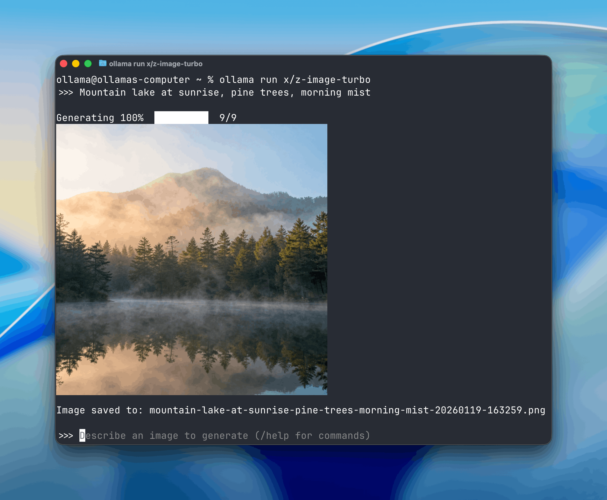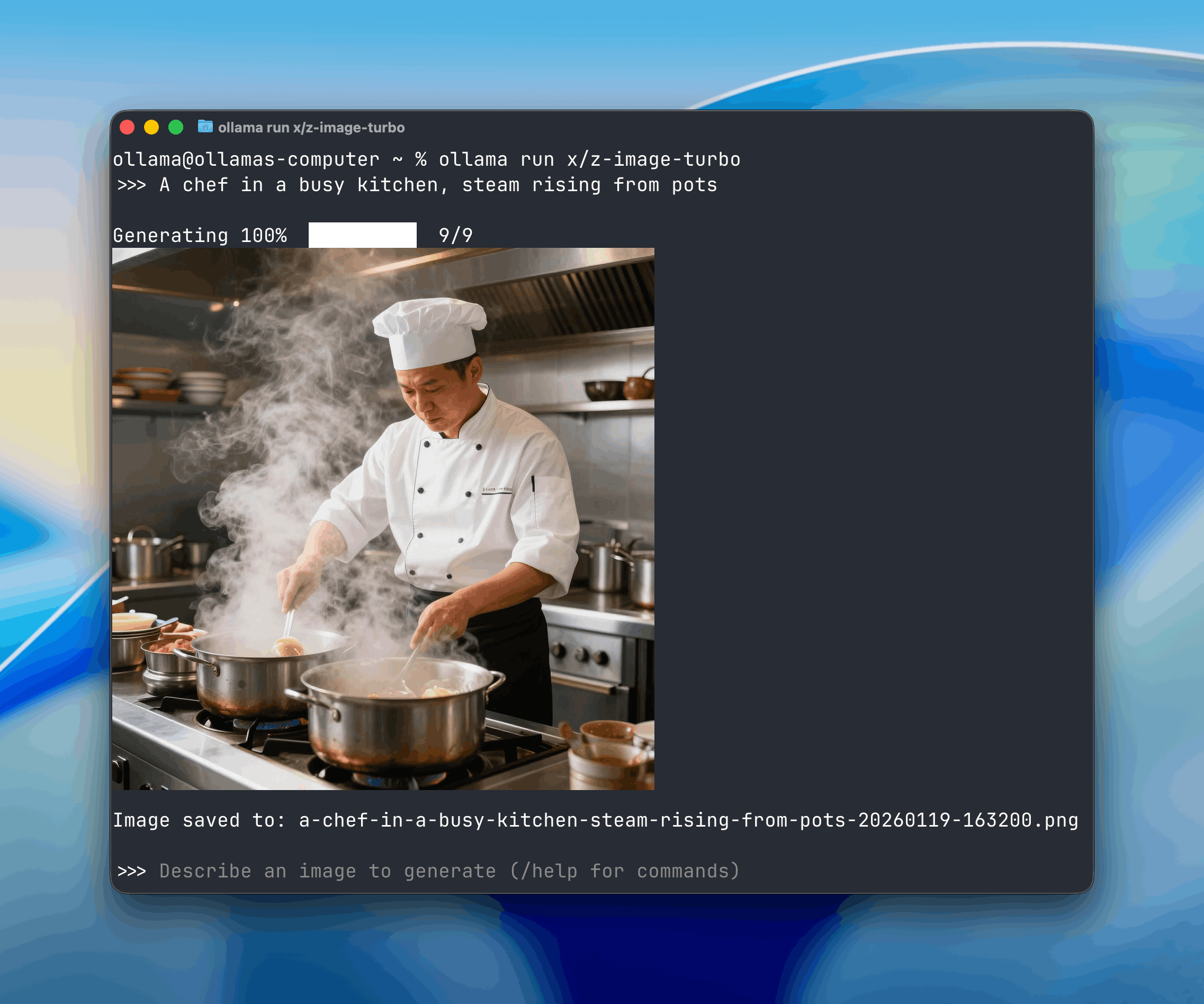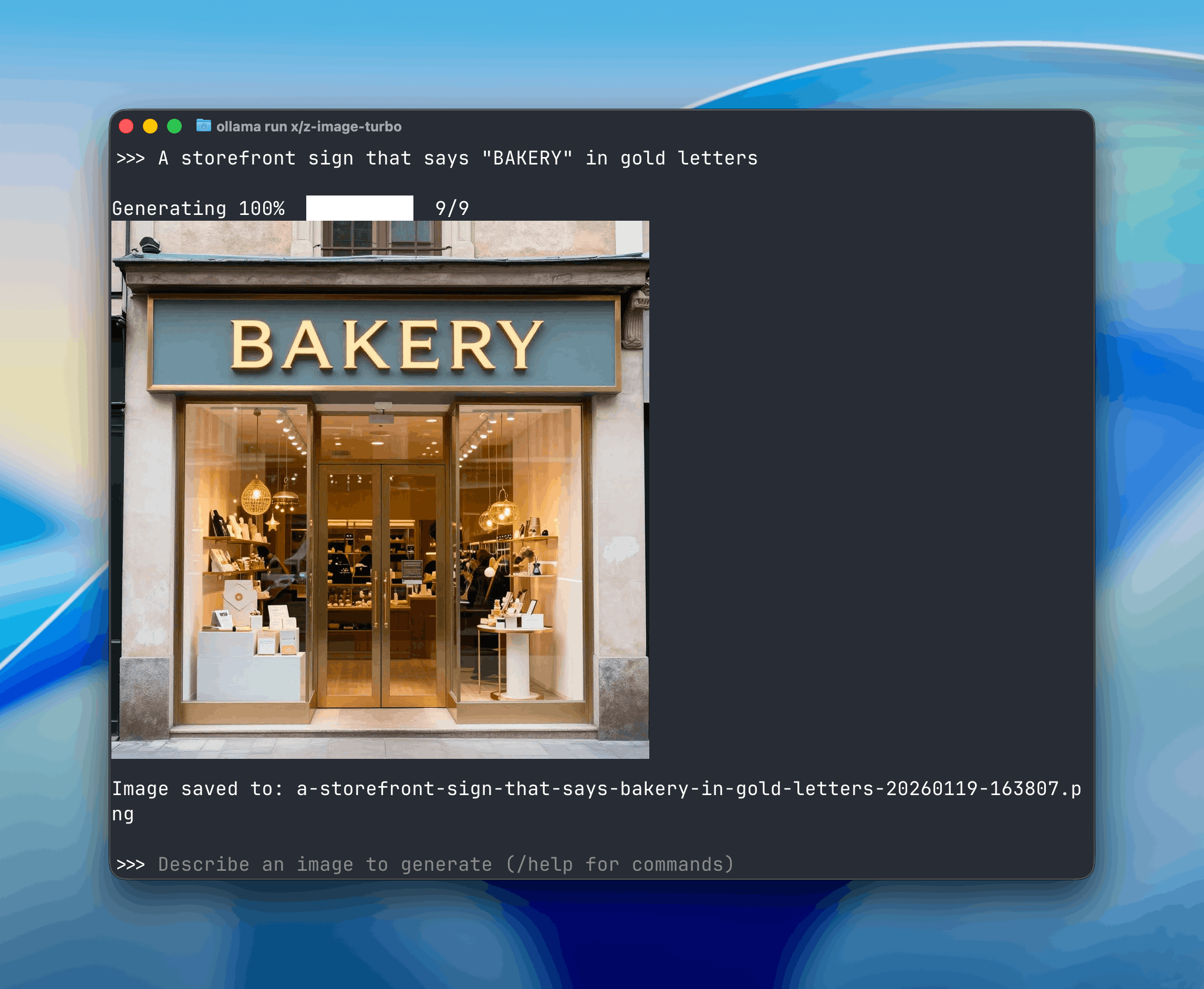 ollama run x/z-image-turbo "a cat holding a sign that says hello world"