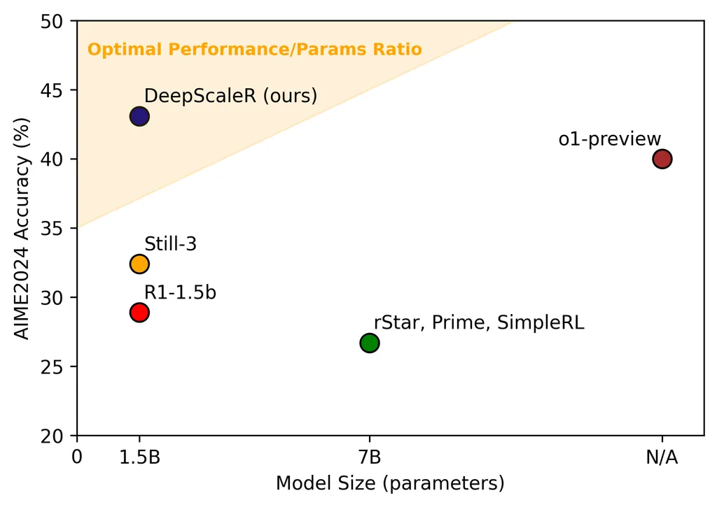We compare DeepScaleR with the base DeepSeek model we use, as well as recent academic works exploring RL for reasoning tasks. DeepScaleR significantly outperforms the base model across all benchmarks, achieving a 14.4% absolute gain on AIME2024 and an 8.1% overall improvement. Additionally, DeepScaleR surpasses recent academic works such as rSTAR, Prime, and SimpleRL, which are finetuned from 7B models. DeepScaleR achieves O1-preview-level performance with only 1.5B parameters—a remarkable efficiency gain.