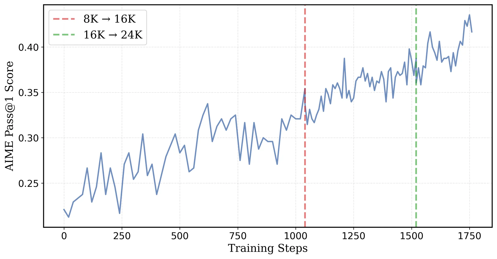 DeepScaleR-1.5B-Preview is a language model fine-tuned from DeepSeek-R1-Distilled-Qwen-1.5B using distributed reinforcement learning (RL) to scale up to long context lengths. The model achieves 43.1% Pass@1 accuracy on AIME 2024, representing a 15% improvement over the base model (28.8%) and surpassing OpenAI’s O1-Preview performance with just 1.5B parameters.