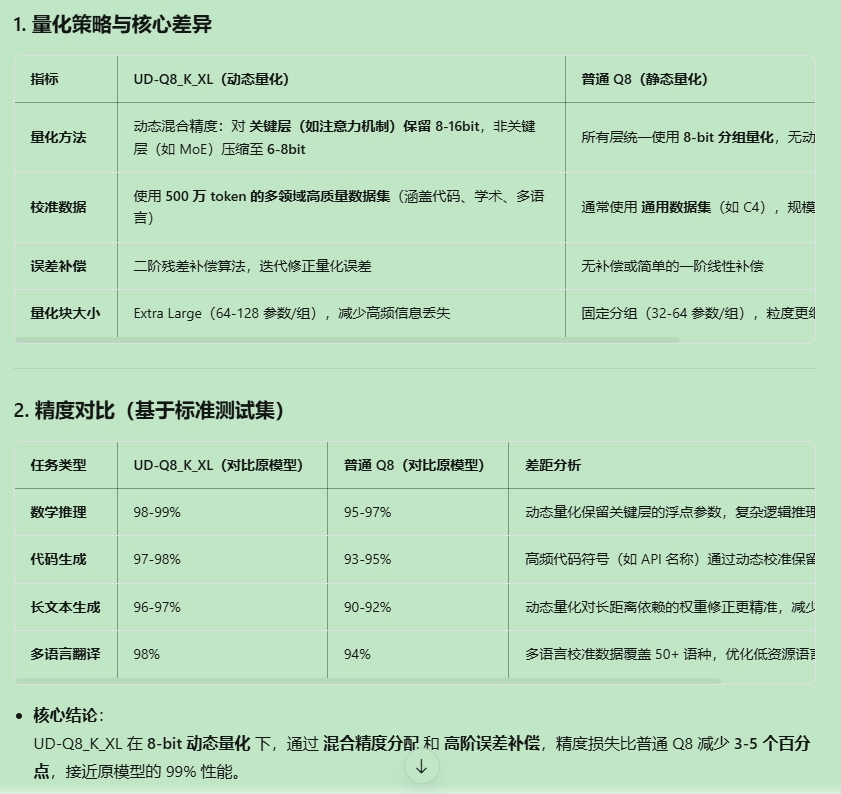 重点:这是unsloth的Q8动态量化版本,精度第一的量化版本!Unsloth Dynamic 2.0 实现了卓越的准确性,并超越了其他领先的量化模型。UD-Q8_K_XL的输出精度远超普通Q8版本!接近FP16版本模型98-99%精度!